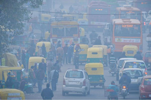 資料圖:新德里街頭,各類機動車在霧霾中擁擠前行