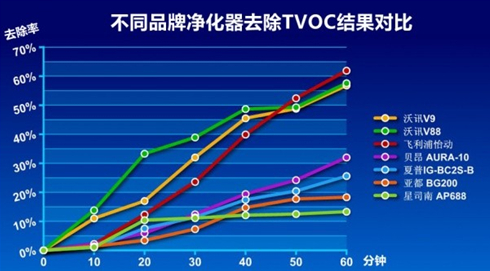 沃訊V9和V88和飛利浦怡動(dòng)這三款產(chǎn)品以絕對優(yōu)異的凈化成績排名第一梯隊(duì),祛除TVOC效果顯著。