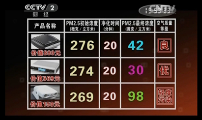 6月14日19:30分,CCTV-2財(cái)經(jīng)頻道《是真的嗎》欄目組委托清華大學(xué)建筑環(huán)境檢測中心,特別針對車載空氣凈化能否去除PM2.5進(jìn)行了效果實(shí)測。